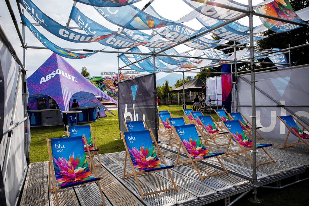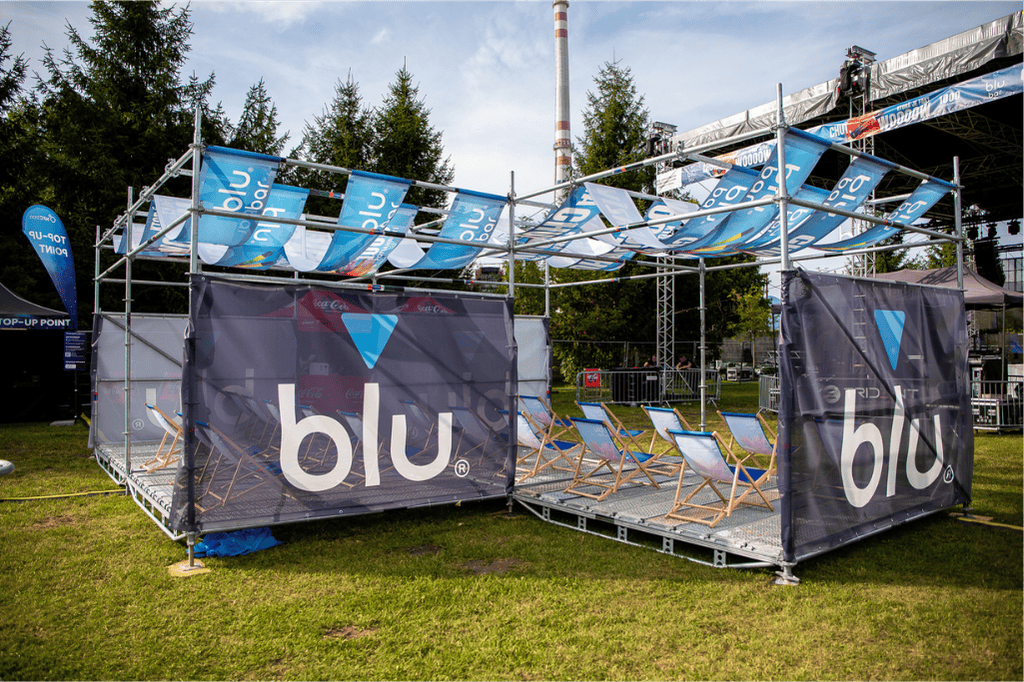 Centrálnu hliníkovú konštrukciu, ktorá vytvorila oddychovú zónu s výhľadom na stage a výrazným brandingom blu.